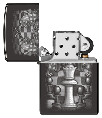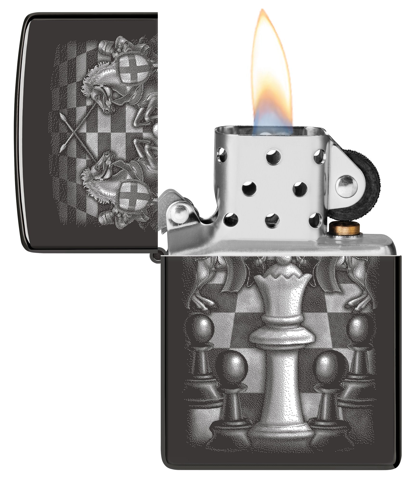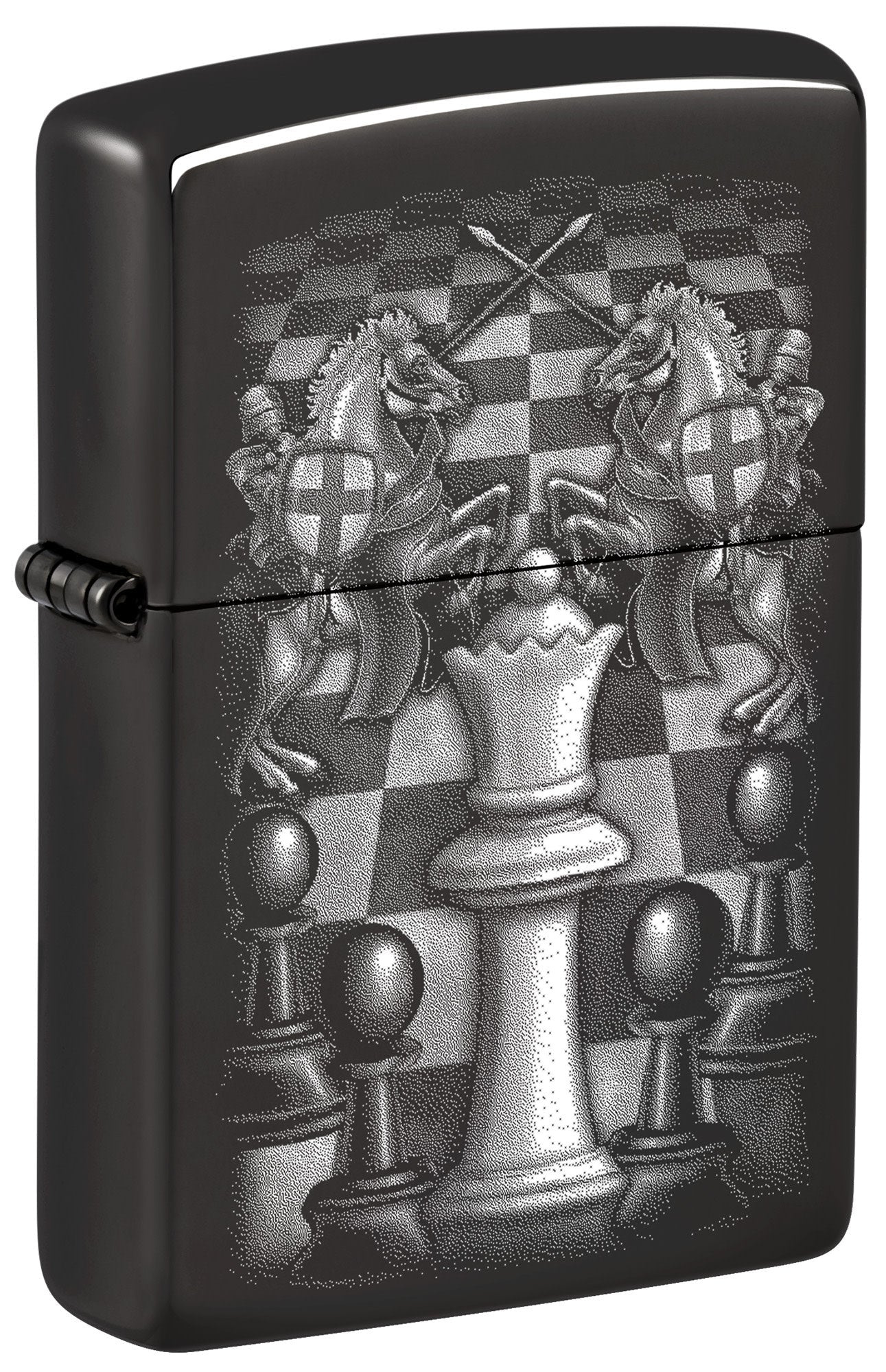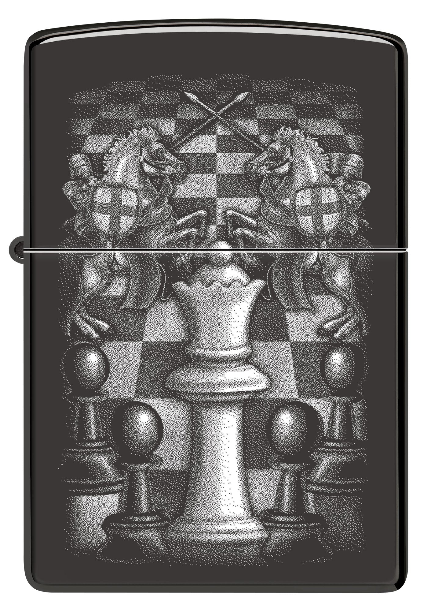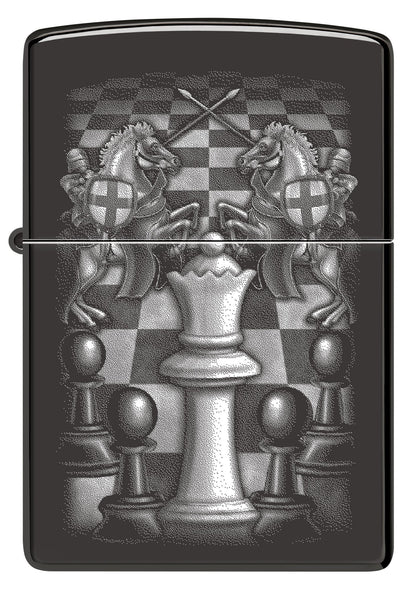 Flanked by her trusted knights, the Queen commands the chessboard on this classic High Polish Black lighter in a stately Color Image design. Comes packaged in a gift box. For optimal performance, fill with Zippo lighter fuel.