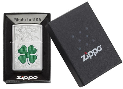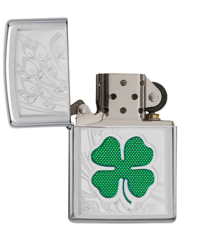 Catch some good luck with this High Polish Chrome windproof lighter. This clover design is created using both color image and auto engrave imprint methods. Comes packaged in a gift box. For optimal performance, fill with Zippo lighter fuel.