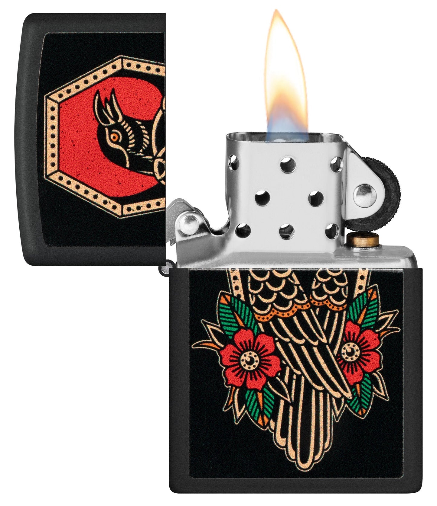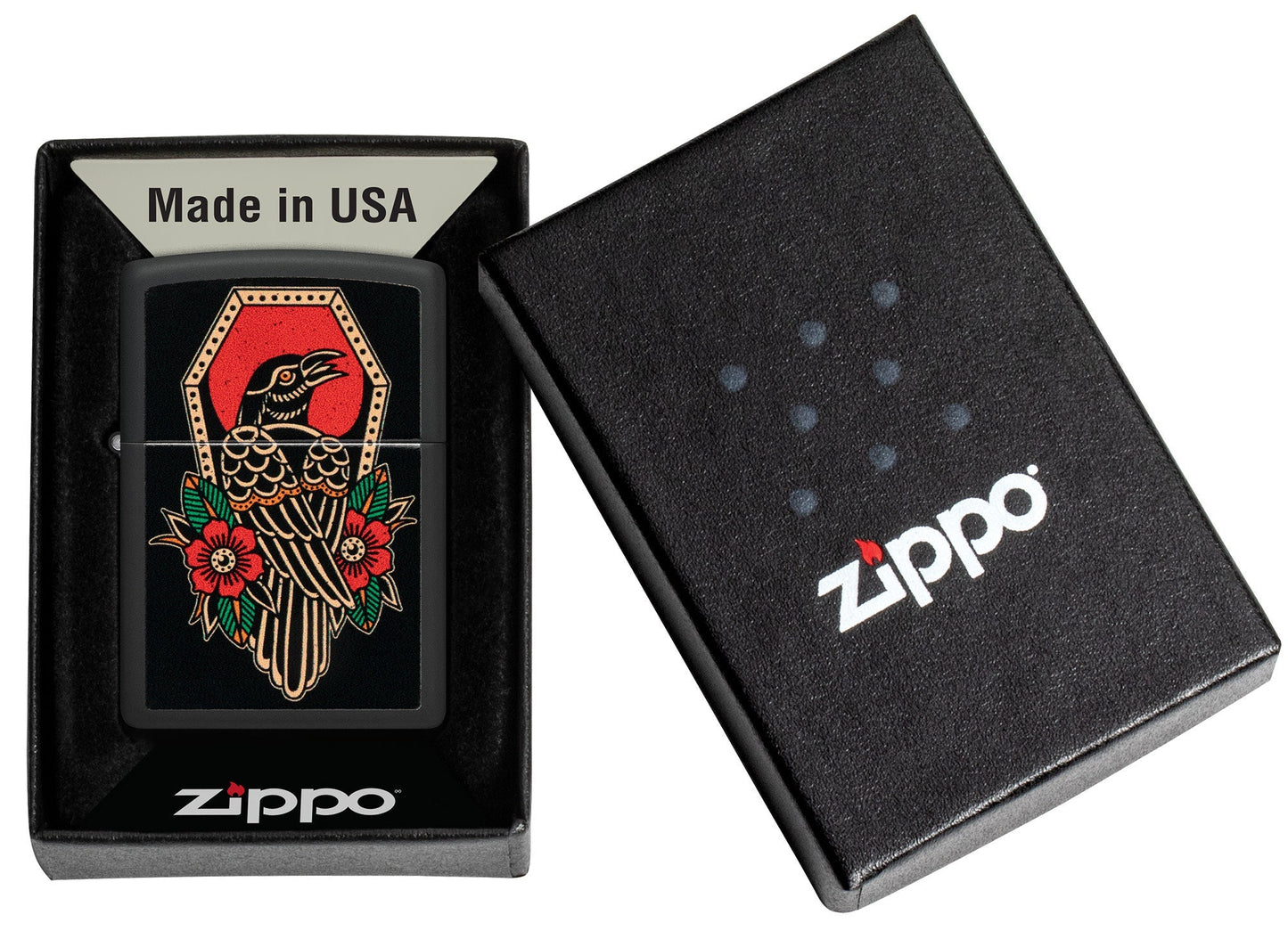 Symbolizing wisdom and foresight, a jet-black crow nestles among bold florals on this Black Matte lighter in a traditional tattoo-inspired Color Image design. Comes packaged in a gift box. For optimal performance, fill with Zippo lighter fuel.