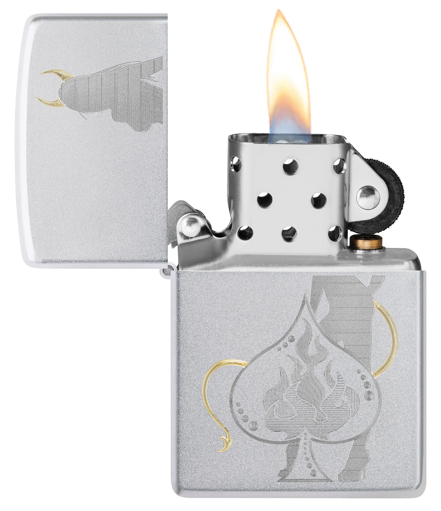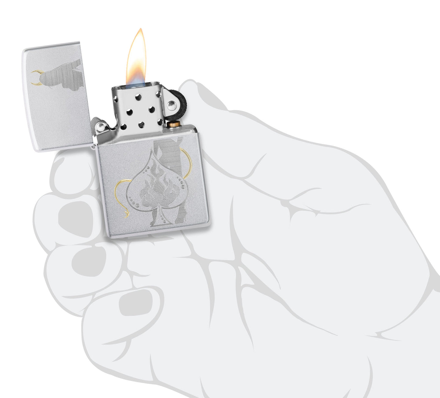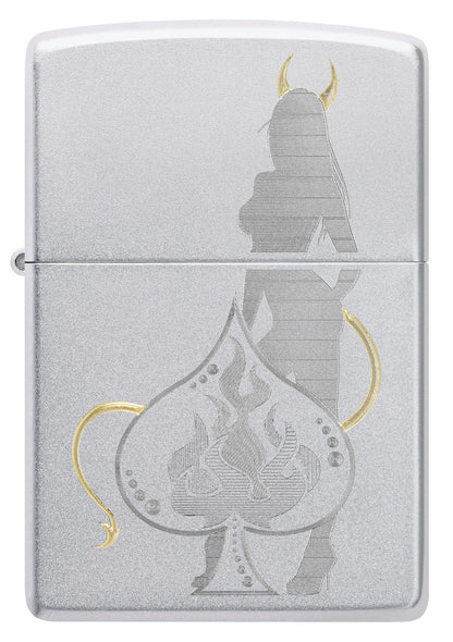 A devilish figure beckons from behind a lucky spade on this playful Satin Chrome lighter. The intricate design and luxurious brass tones are achieved with our Auto Two-Tone process. Comes packaged in a gift box. For optimal performance, fill with Zippo lighter fuel.