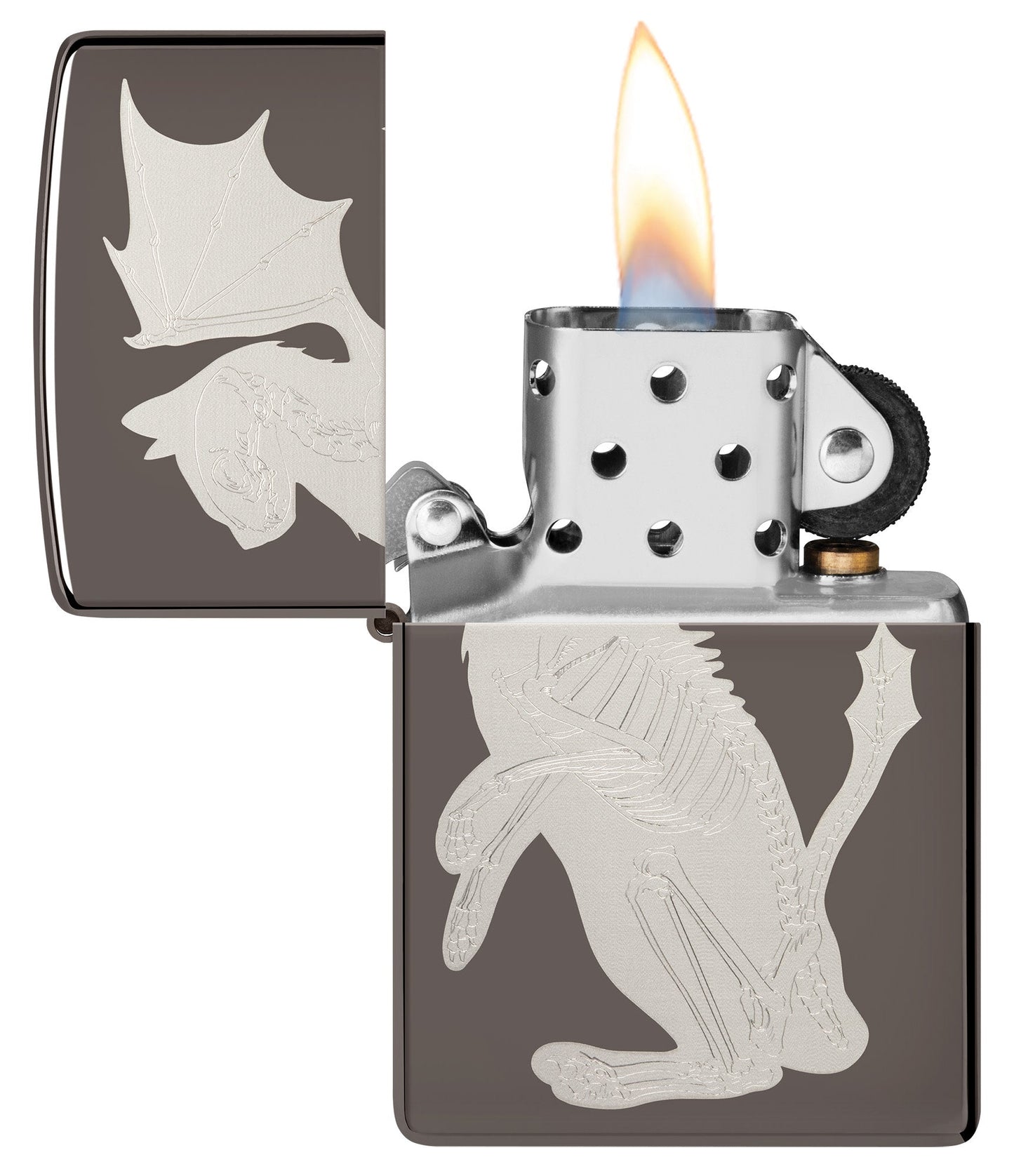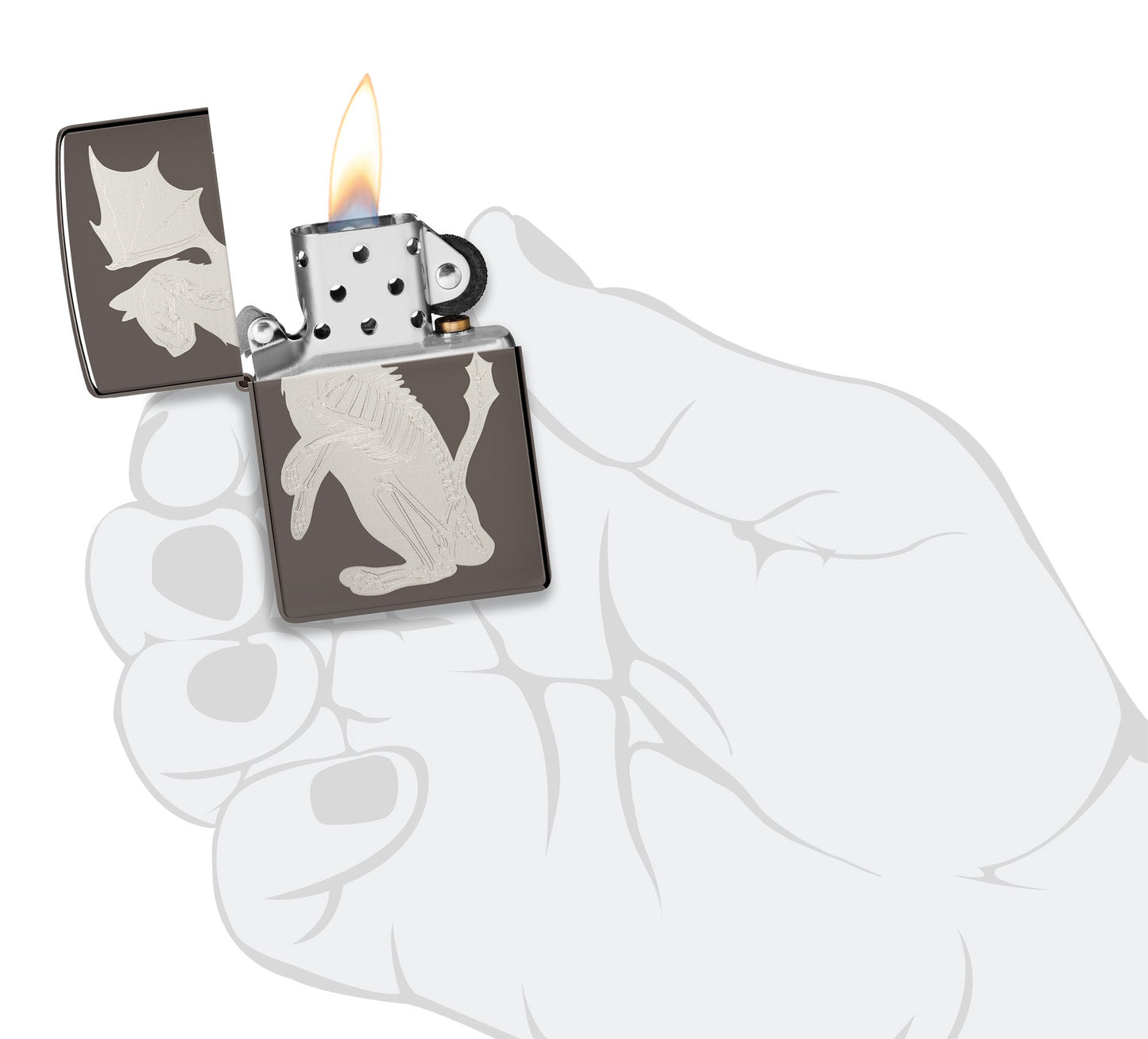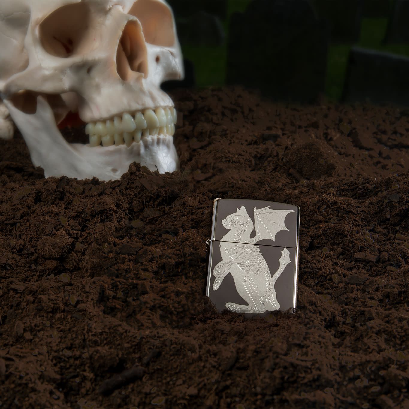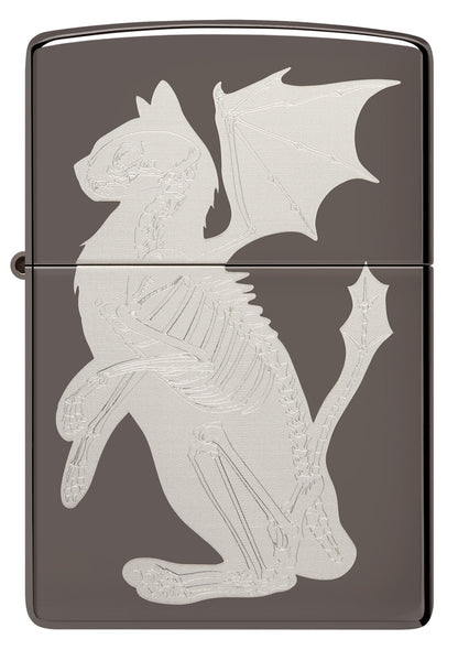 An X-ray reveals what we've long suspected: that cats are mystical shapeshifters we'll never truly understand. The Laser engraved process is used on this Black Ice® lighter to depict the inner dragon within the familiar feline form. Comes packaged in a gift box. For optimal performance fill with Zippo lighter fuel.