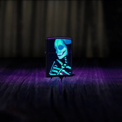 A gleaming skeleton, inspired by traditional sugar skulls, poses stoically on this classic Black Matte lighter. The dazzling watercolor Color Image design illuminates under ultraviolet light thanks to our specialty Black Light process. Comes packaged in a gift box. For optimal performance, fill with Zippo lighter fuel.