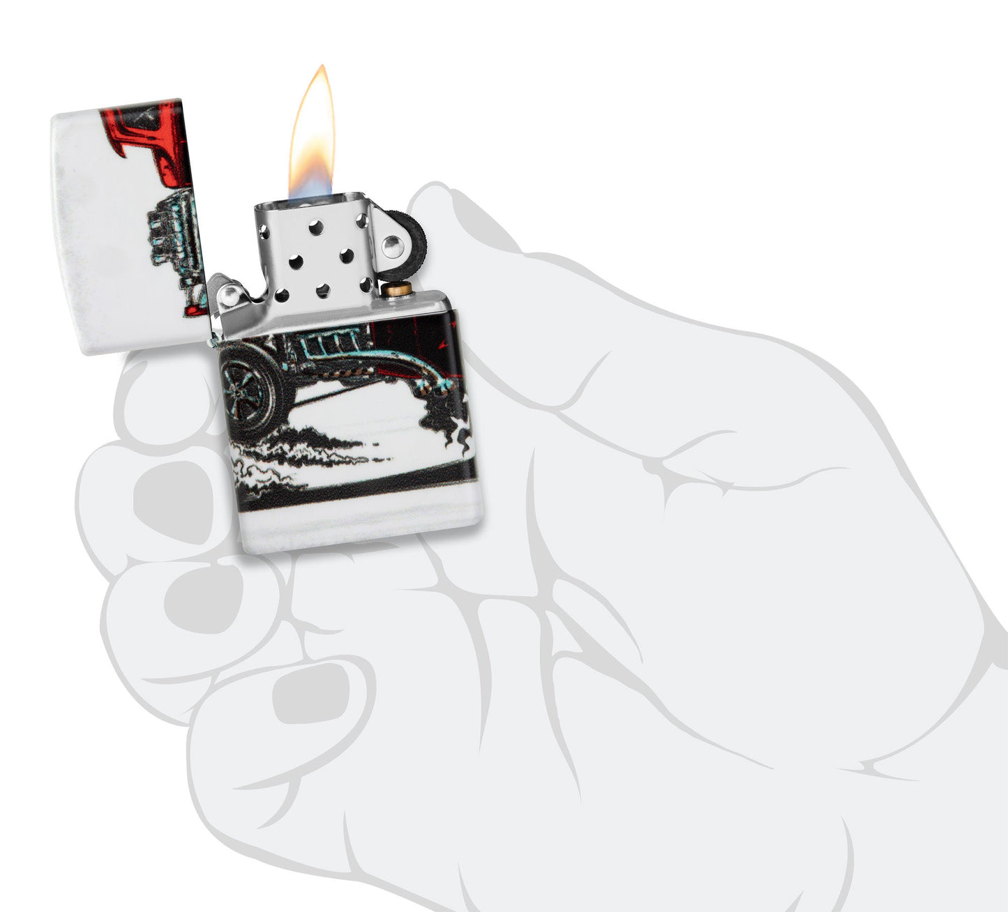 Calling all gearheads… a cherry-red hotrod commands this 540 Color design, kicking up dust around all sides of the lighter in the seamless high-speed scene. Comes packaged in a gift box. For optimal performance, fill with Zippo lighter fuel.