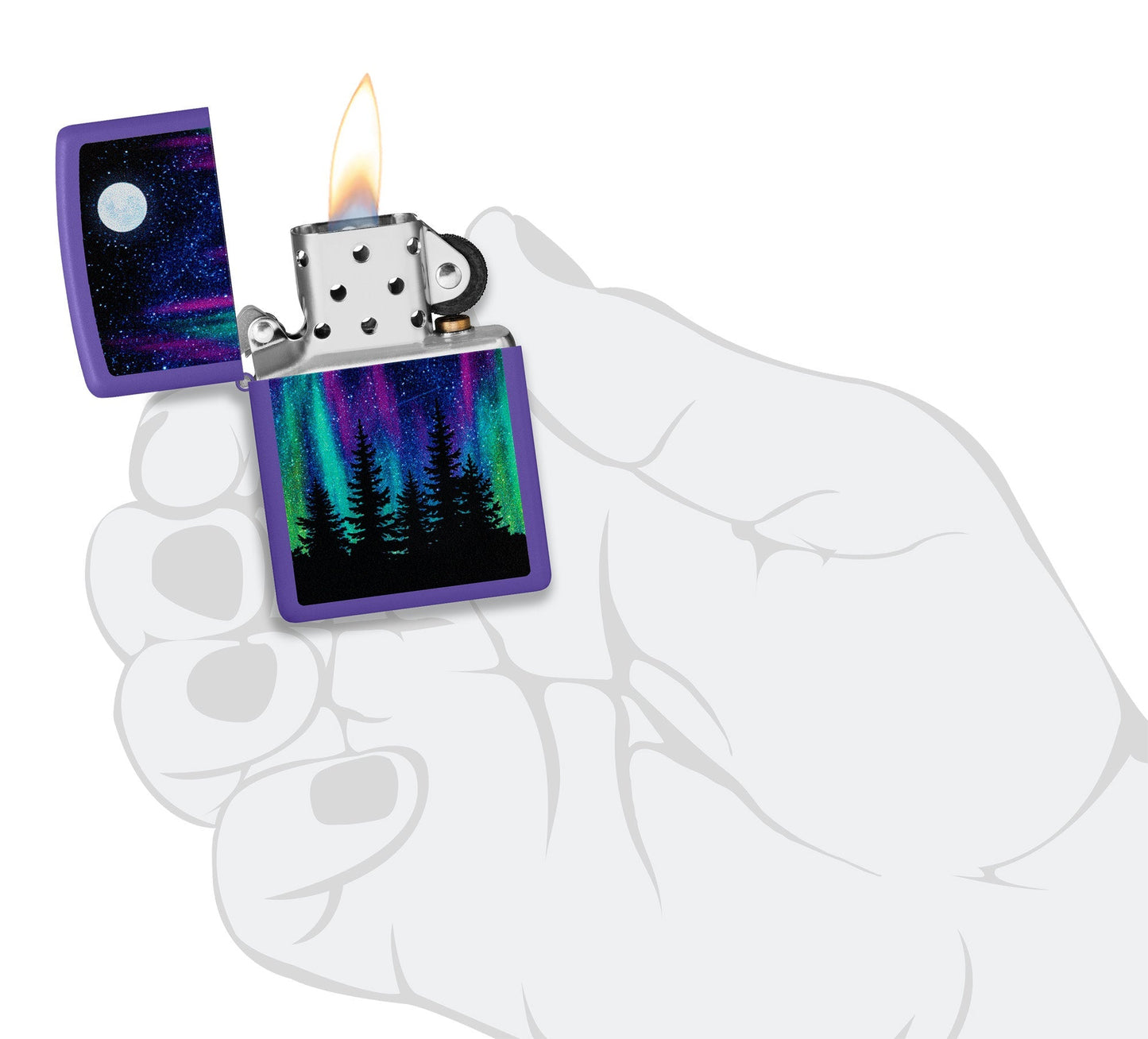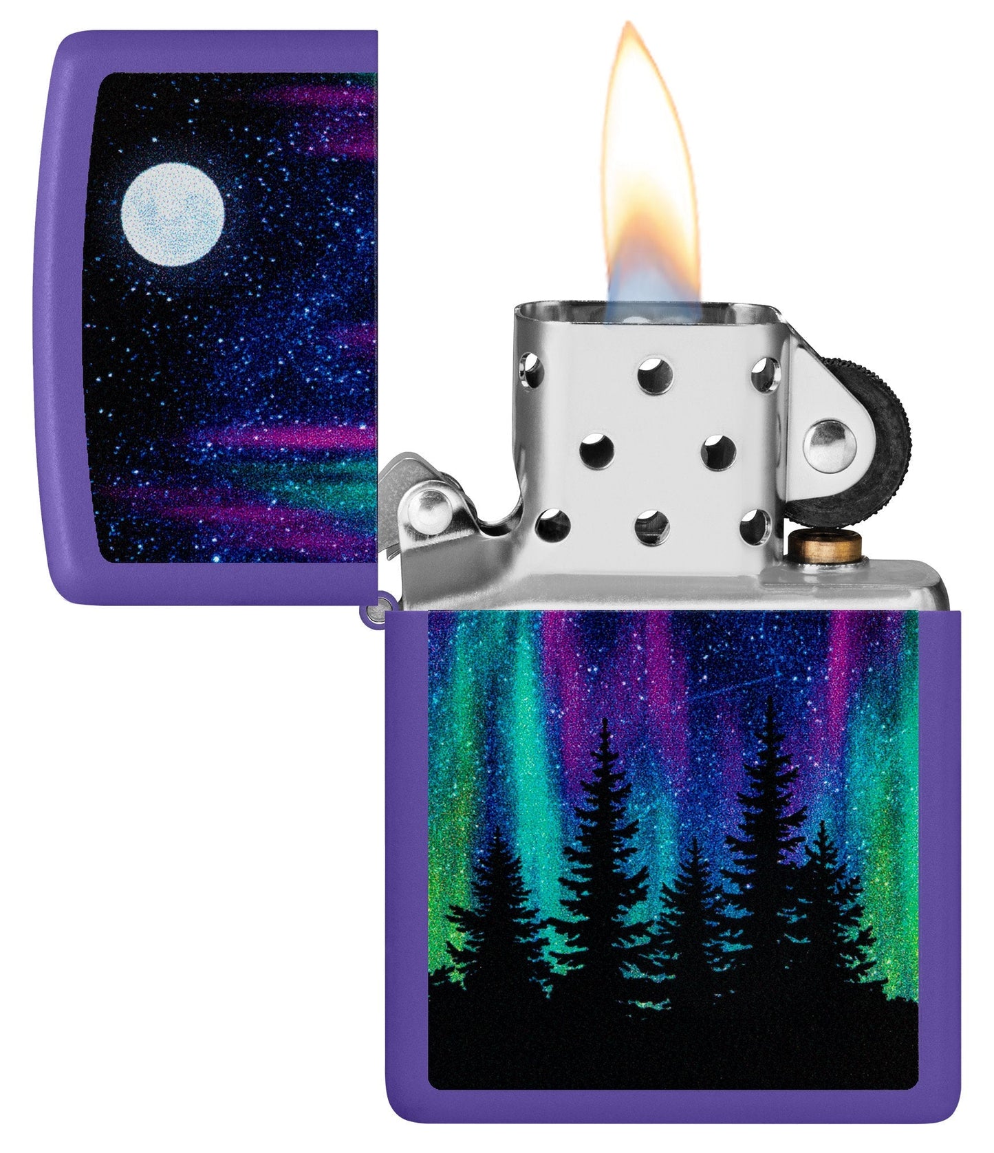 The magic of the Northern Lights is brought to life on this regal Purple Matte lighter. The majestic colors of one of Nature's greatest wonders swirl and mingle across a brilliant starry sky in this stunning Color Image design. Comes packaged in a gift box. For optimal performance, fill with Zippo lighter fuel.