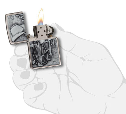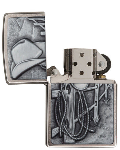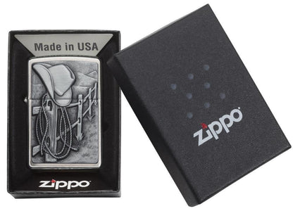 This Brushed Chrome windproof lighter has a emblem attached with a western scene. Comes packaged in a gift box. For optimal performance, fill with Zippo lighter fuel.