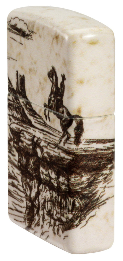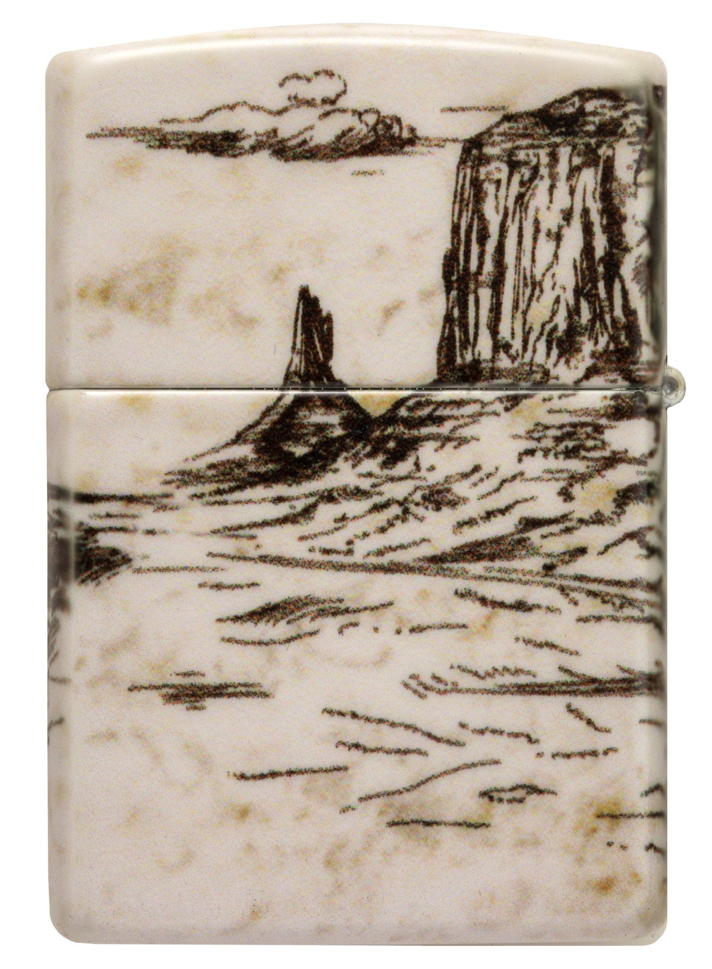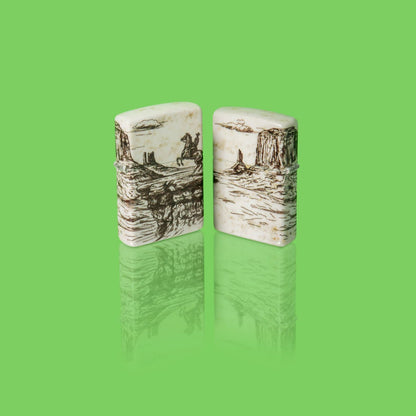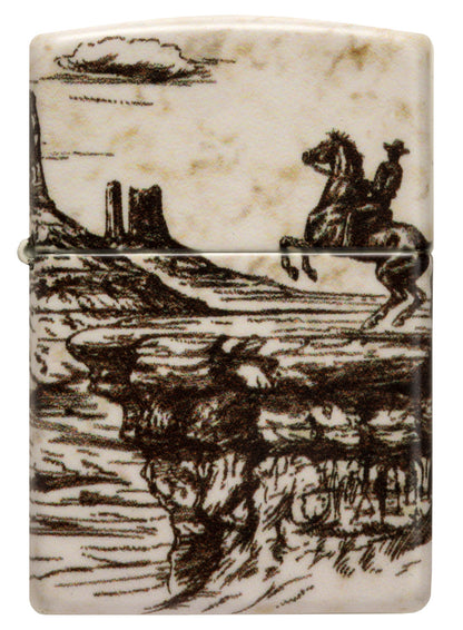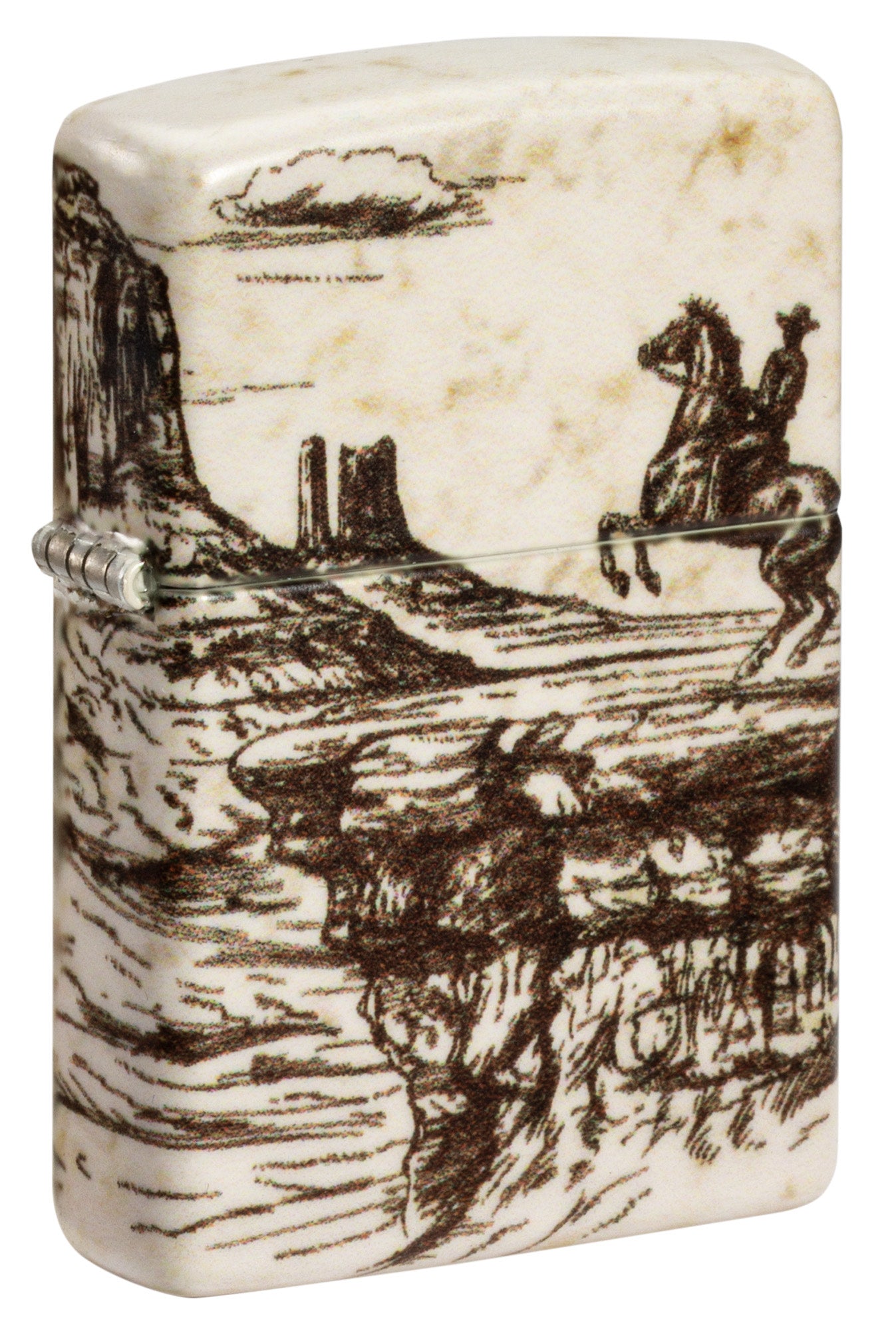 A lone rancher surveys the rugged frontier on this 540 Color lighter, which features the intricate monochromatic landscape sprawling across all sides. Comes packaged in a gift box. For optimal performance, fill with Zippo lighter fuel.