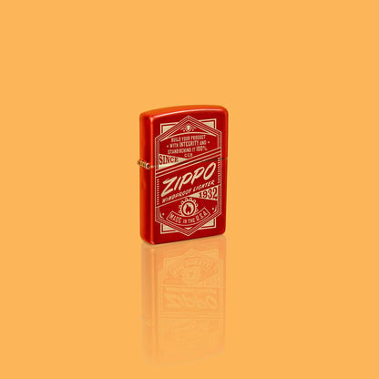Inspired by vintage advertisements, this Metallic Red lighter is laser engraved with one of Zippo's original logos underneath our founder's credo: "Build your product with integrity and stand behind it 100%."Comes packaged in a gift box. For optimal performance, fill with Zippo lighter fuel.